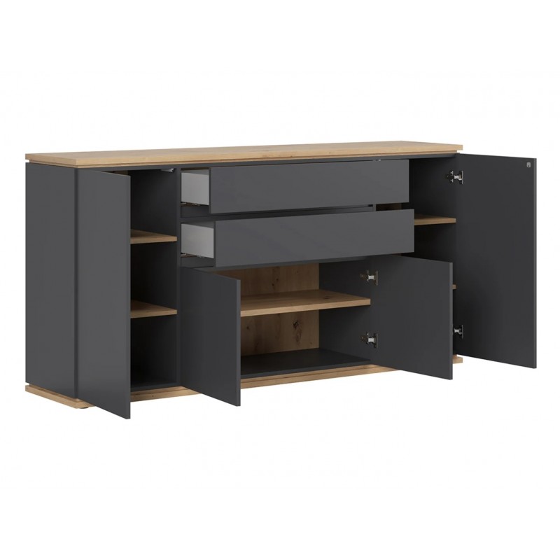 Komoda ma wymiary 184 x 93 x 42 cm, dzięki czemu jest bardzo pojemnym i efektownym meblem. Cztery fronty uchylne i dwie szuflady pozwolą uporządkować i posegregować ubrania, naczynia lub dokumenty.