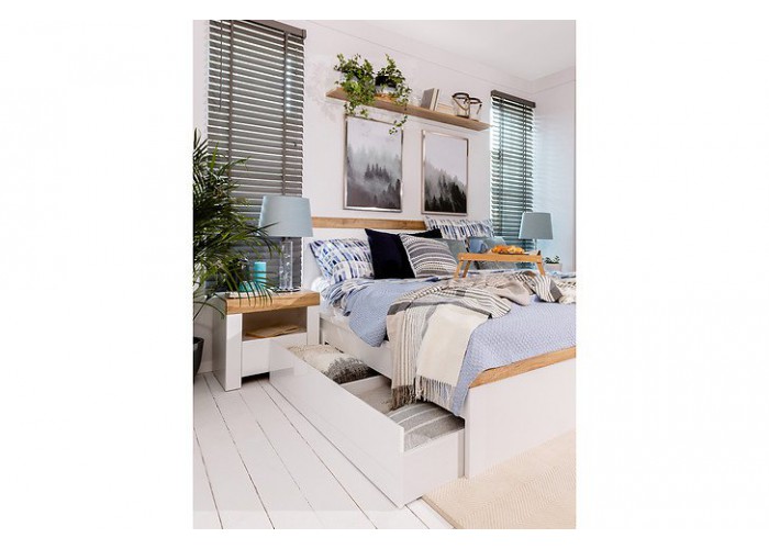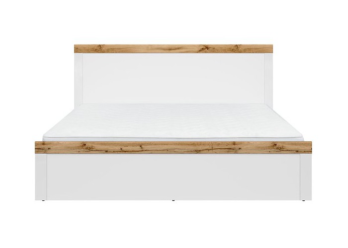 - Listwy wieńczące wezgłowie zostały wykonane w kolorze dąb wotan i kontrastują z bielą korpusu. Taki duet nawiązuje stylistyką do całej kolekcji.
