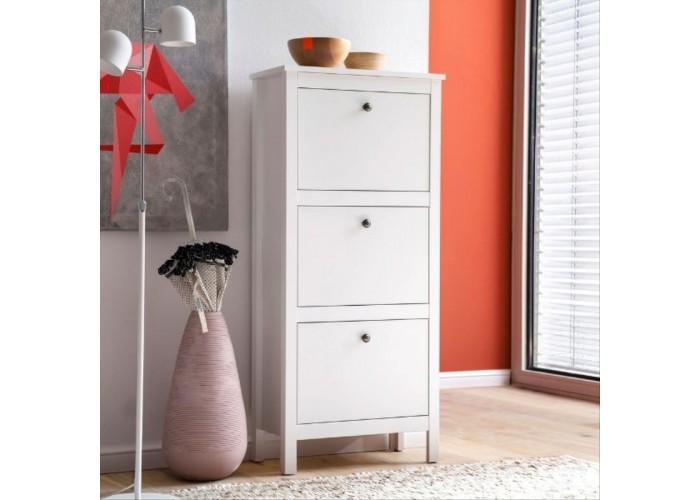 Szafka na buty 3k z kolekcji OLE posiada trzy pojemne komory do przechowywania butów, dzięki swojej uniwersalnej białej kolorystyce sprawdzi się w każdej aranżacji, dopełniając wolną przestrzeń.