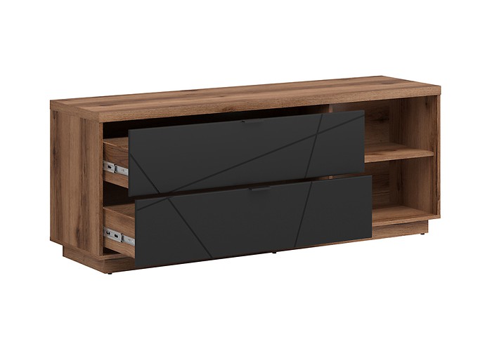 Nowoczesna szafka RTV to 2 wygodne półki, które możesz wykorzystać do przechowywania niezbędnego sprzętu elektronicznego. Dużo miejsca na drobiazgi zapewniają 2 praktyczne szuflady – przechowasz tam pilot do telewizora czy kolekcje płyt DVD. Za właściwą cyrkulację powietrza odpowiedzialny jest otwór wentylacyjny, który służy także do uporządkowania kabli. Powierzchnia blatu jest odpowiednim miejscem na postawienie telewizora, dodatkowych głośników i dekoracji, np. w postaci świeżych kwiatów.
