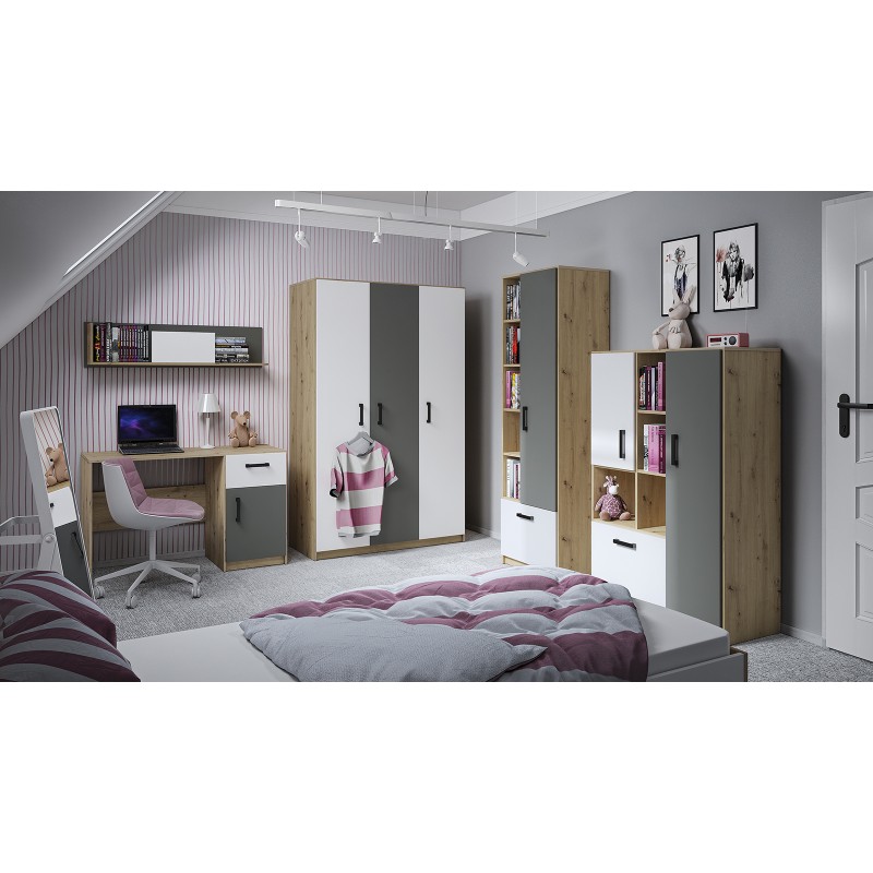 Nowoczesna i zdecydowana kombinacja kolorów - białego alpejskiego i antracytowego z klasycznie usłojonym dębem artisan - odzwierciedla dynamiczny temperament nastolatków.  Geometria frontów i korpusów tworzy efekt porządku, spójności oraz młodzieżowej elegancji.  Kontrastujące czarne uchwyty podkreślają nieprzeciętność mebli Fini.
