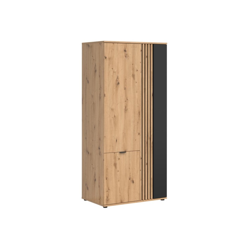 Szafa Vabres prezentuje się w pięknym odcieniu dąb artisan, który wnosi do wnętrza ciepło i naturalny urok. Kontrastujące czarne elementy oraz dekoracyjne lamelki dodają meblowi nowoczesnego stylu i elegancji, tworząc harmonijną kompozycję.
